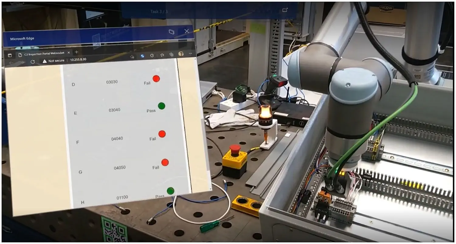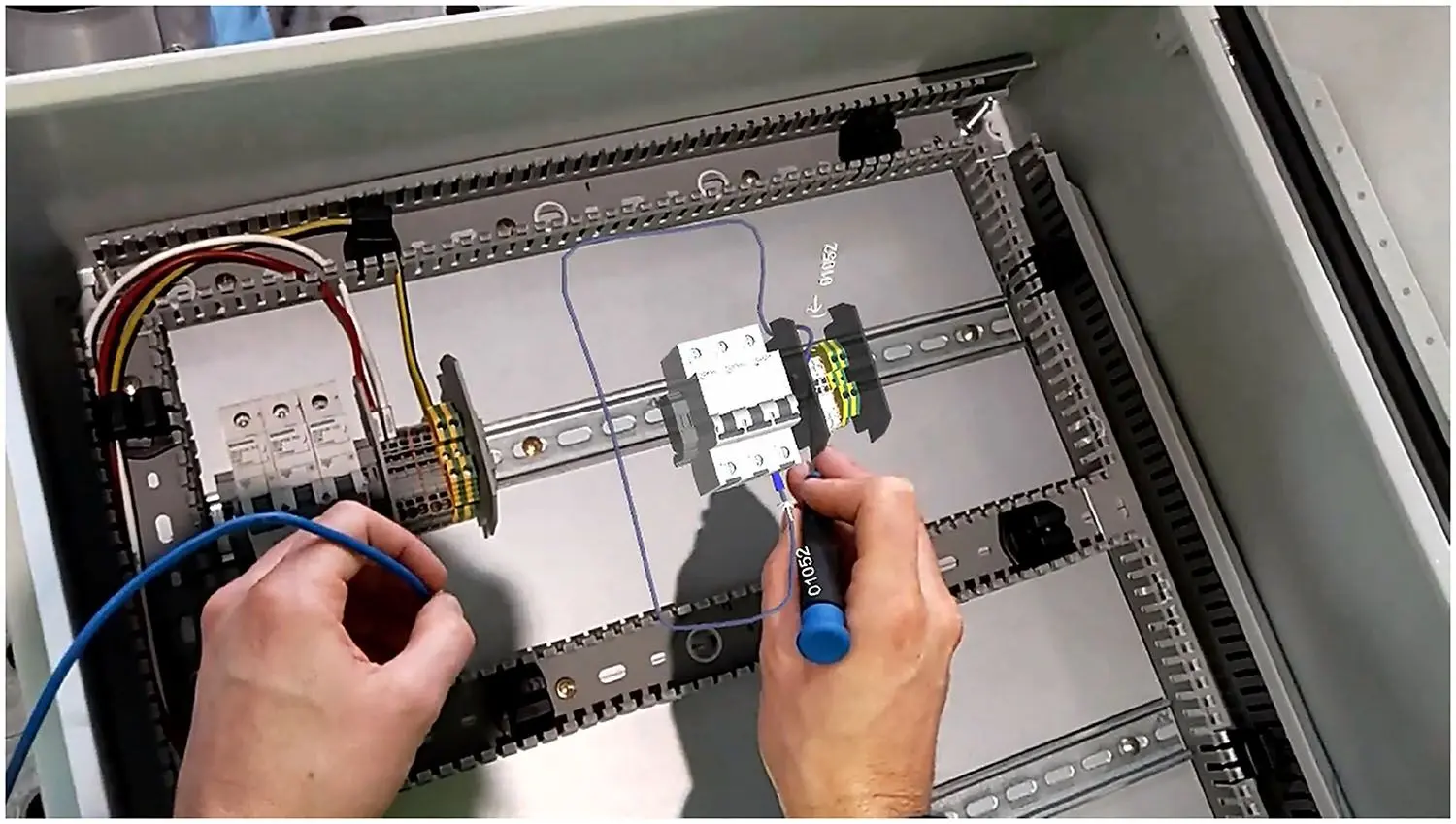 Участники выполняли монтаж проводки в электрическом шкафу, получая цифровые инструкции и голограммы через AR -очки (Hololens 2). Они могли общаться с удаленным наставником через видеозвонки. После завершения работы кобот проверял качество монтажа с помощью машинного зрения.