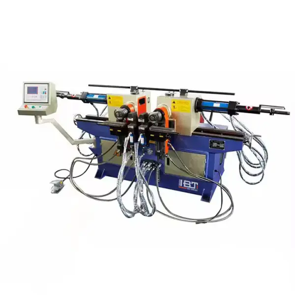 Двухголовочный трубогибочный станок (двусторонний трубогибочный станок) предназначен для изготовления симметричных конструкций — рам, каркасов стульев и столов. Есть модификации с вращающейся головкой, способной поворачиваться на 90 градусов в обе стороны. Материалы трубы — металлы: сталь, в том числе нержавеющая, медь, алюминий, бронза, латунь и другие. При сопряжении с ЧПУ (числовое программное управление) эффективность можно значительно повысить, особенно при серийном выпуске.