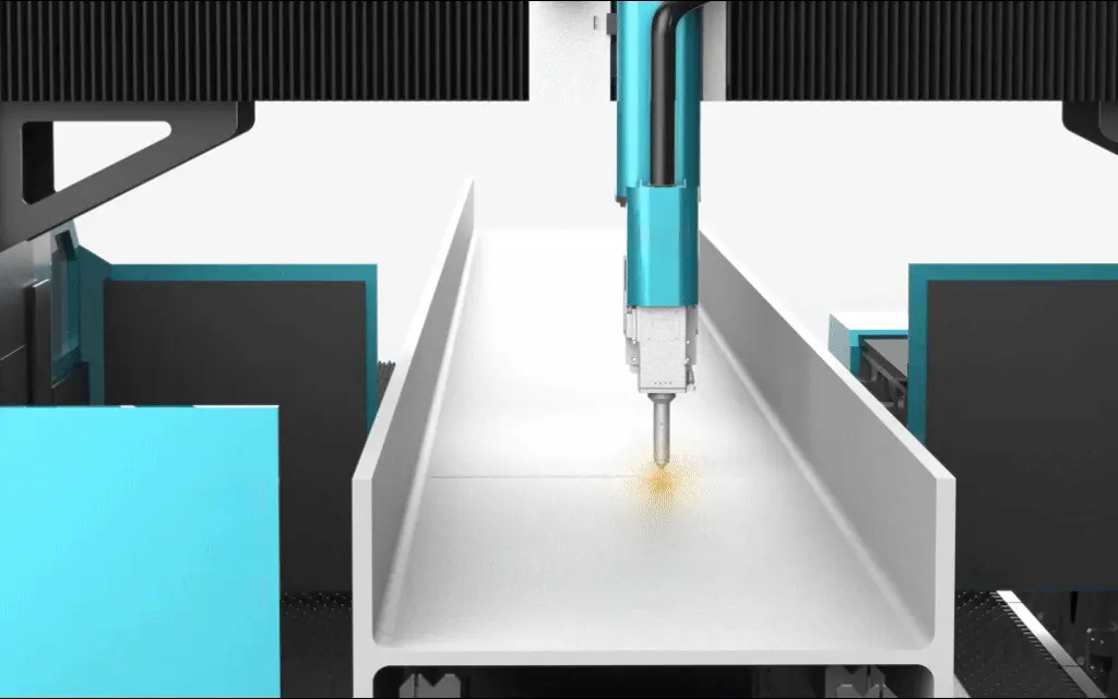 Обработка неподвижно закрепленной двутавровой балки путем перемещения лазерной головки с большим ходом вдоль ее длины. Выполняет операции: резка в размер, вырезка отверстий, фрезеровка пазов, обработка закруглений и др. Поддерживает все формы разделки кромок, включая сложные соединения внахлест, и работает с 3D-моделями Tekla.