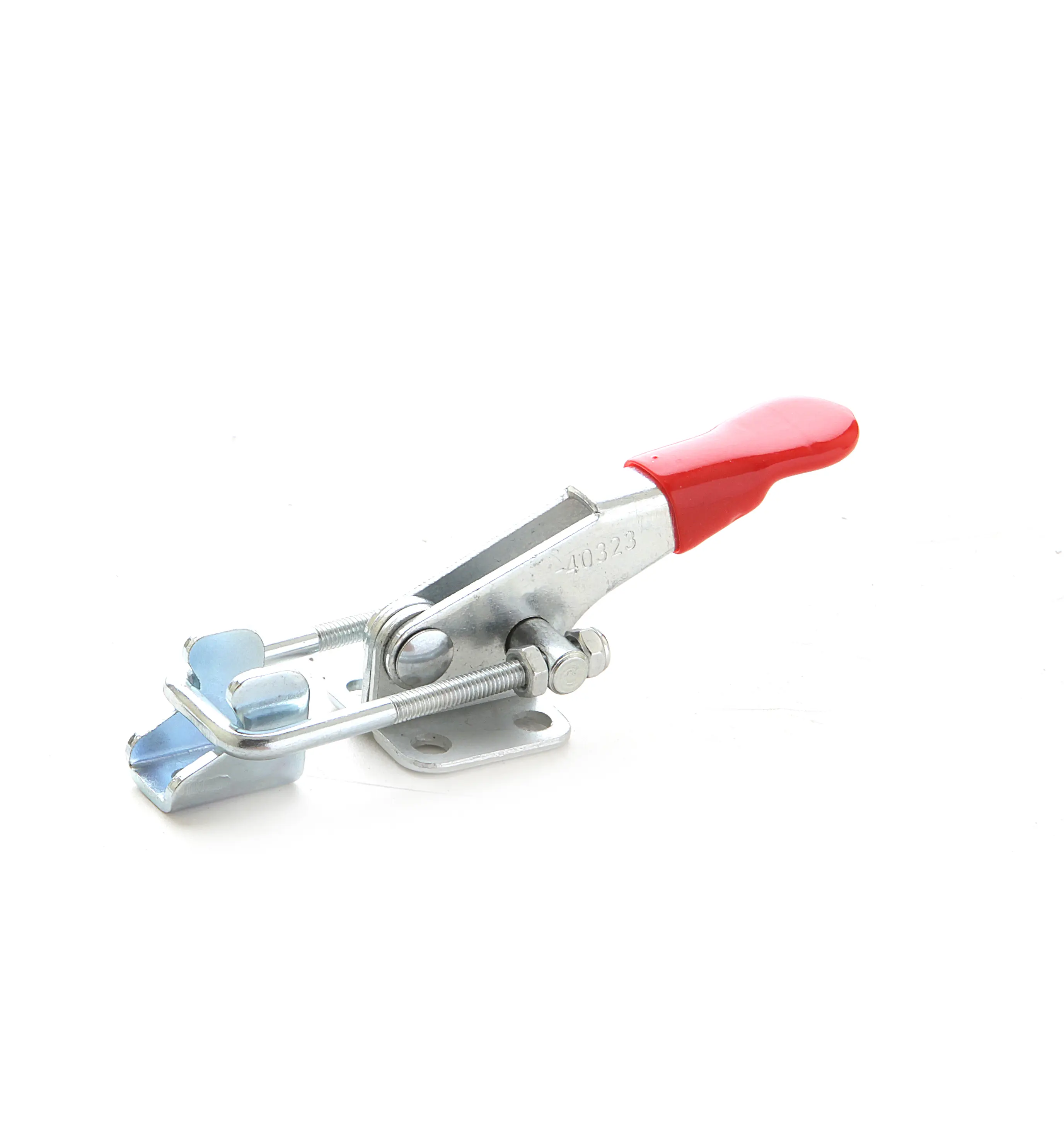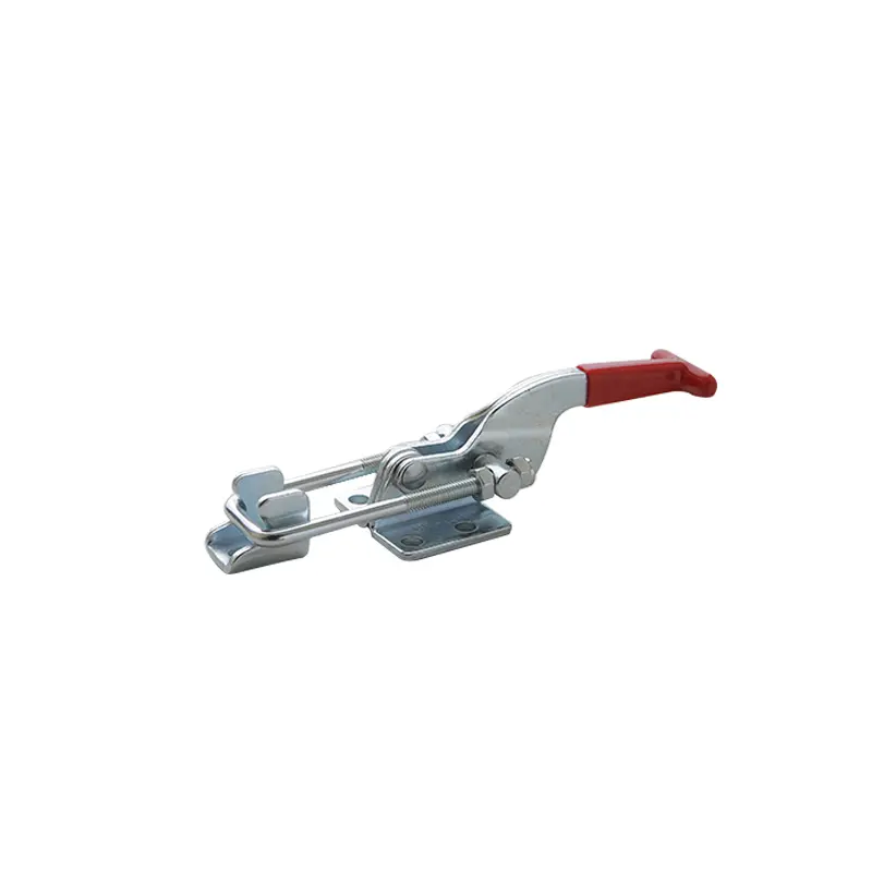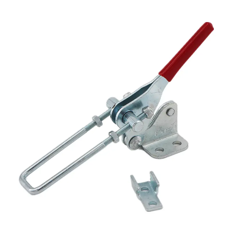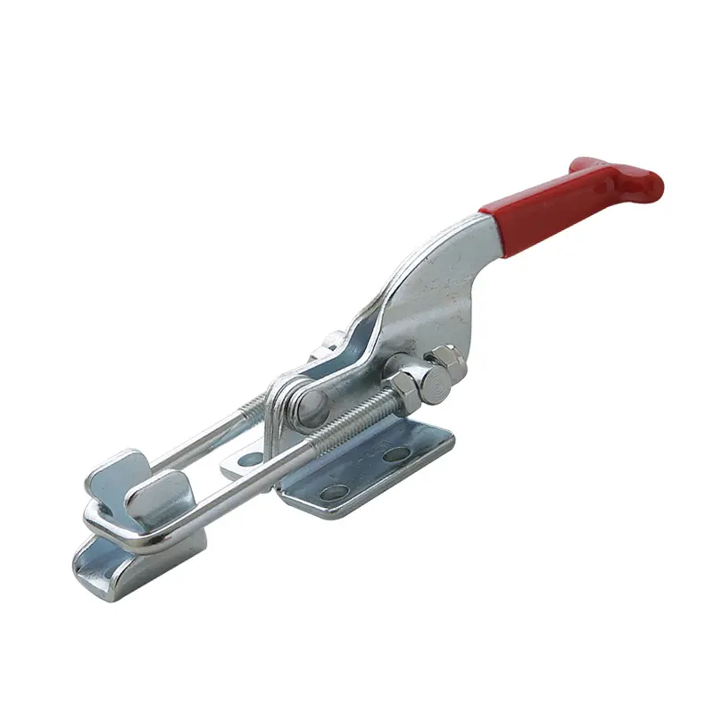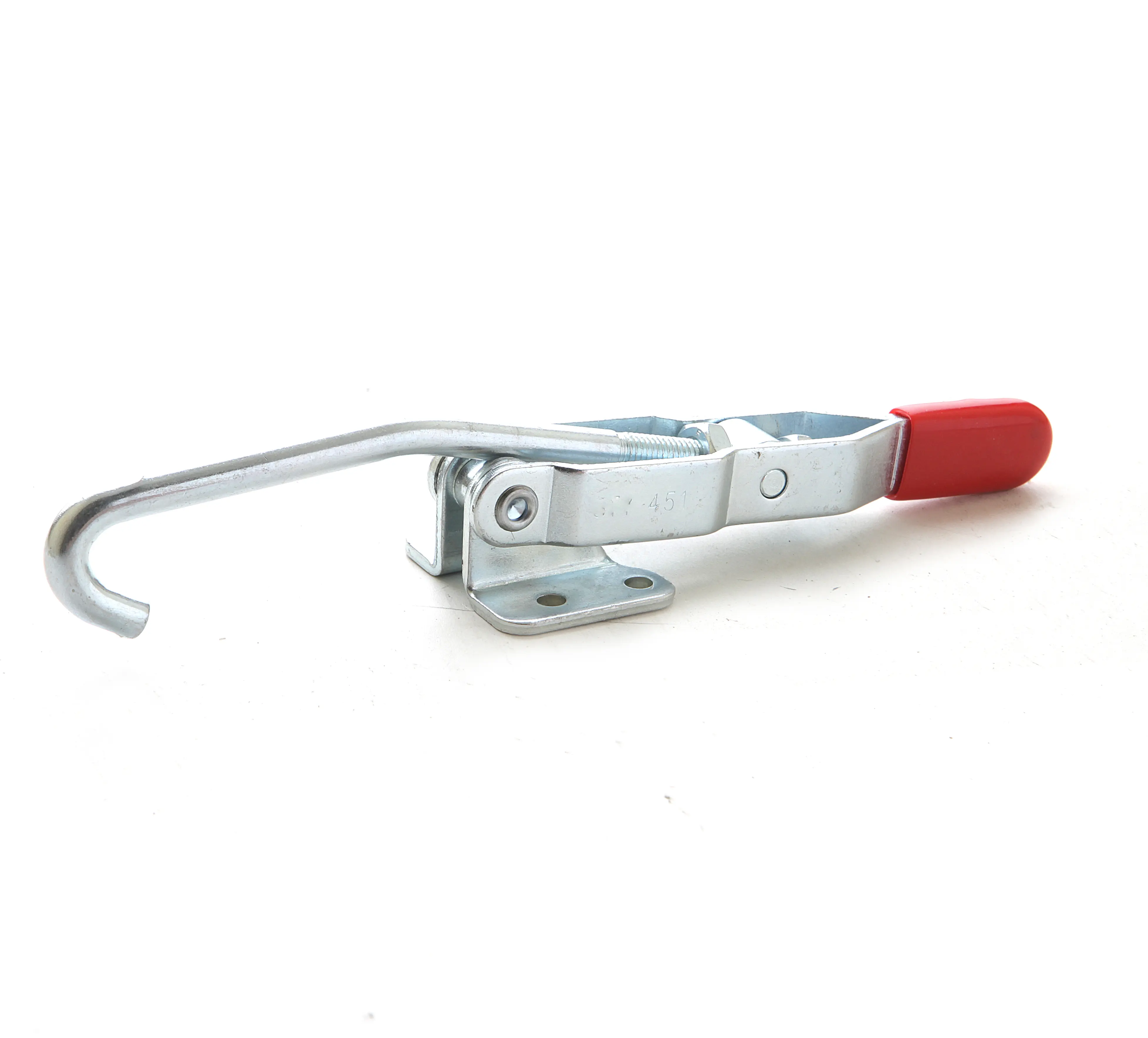 может работать либо в одной плоскости, либо под прямым углом. Зажимы стягивающего типа применяются для плотной стыковки двух изделий. Процесс фиксации происходит за счет зацепления крюка зажима за ответную часть. Такой механизм зажима ещё называют натяжной замок или зажим замок.