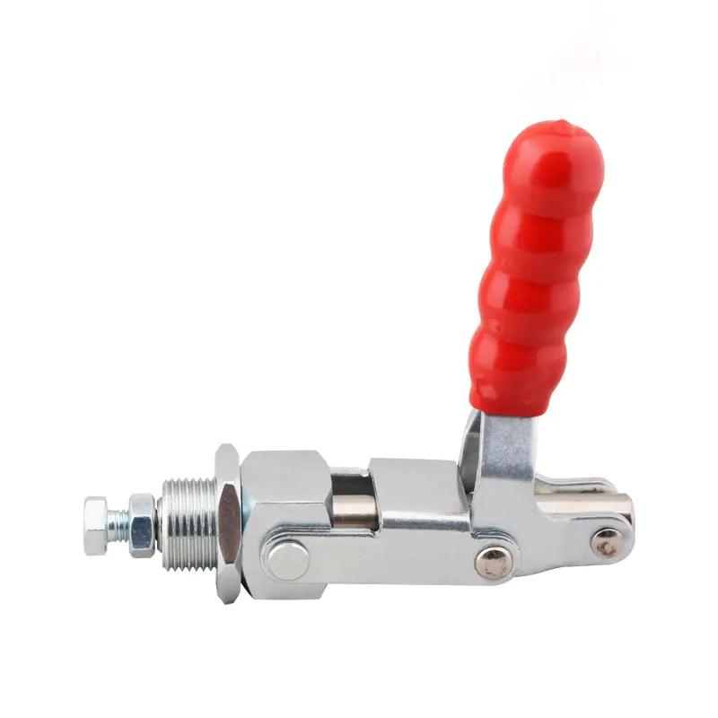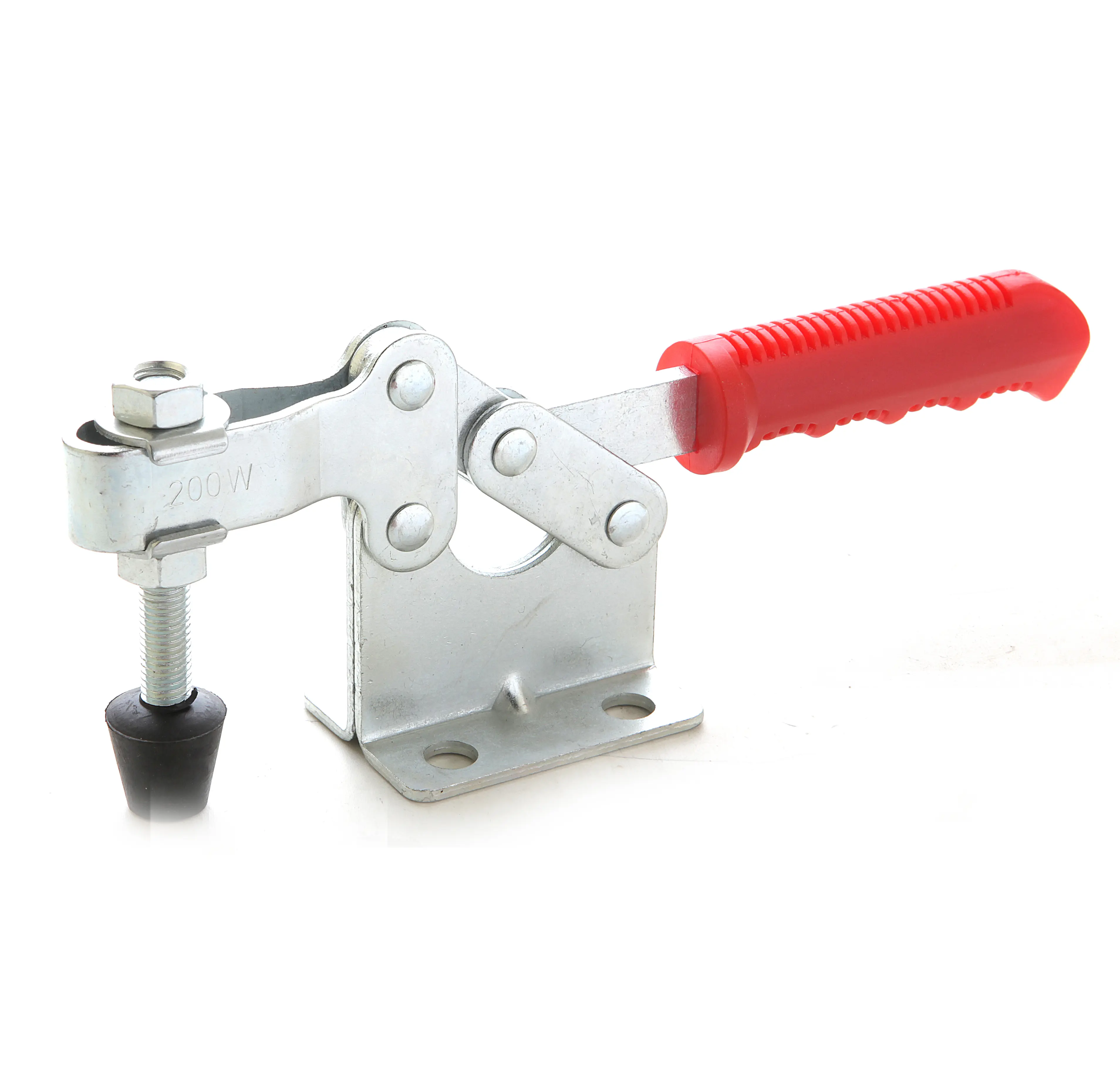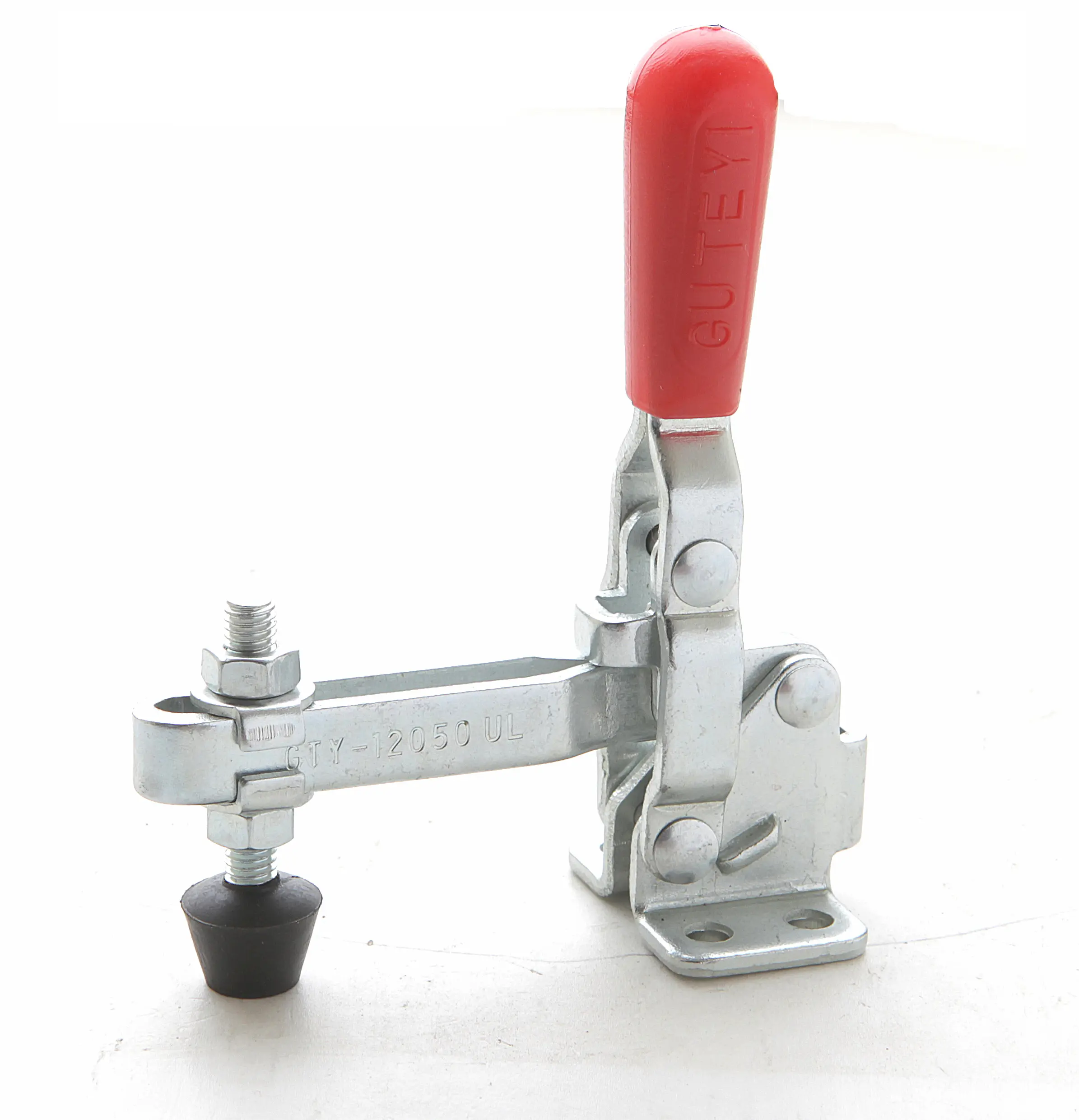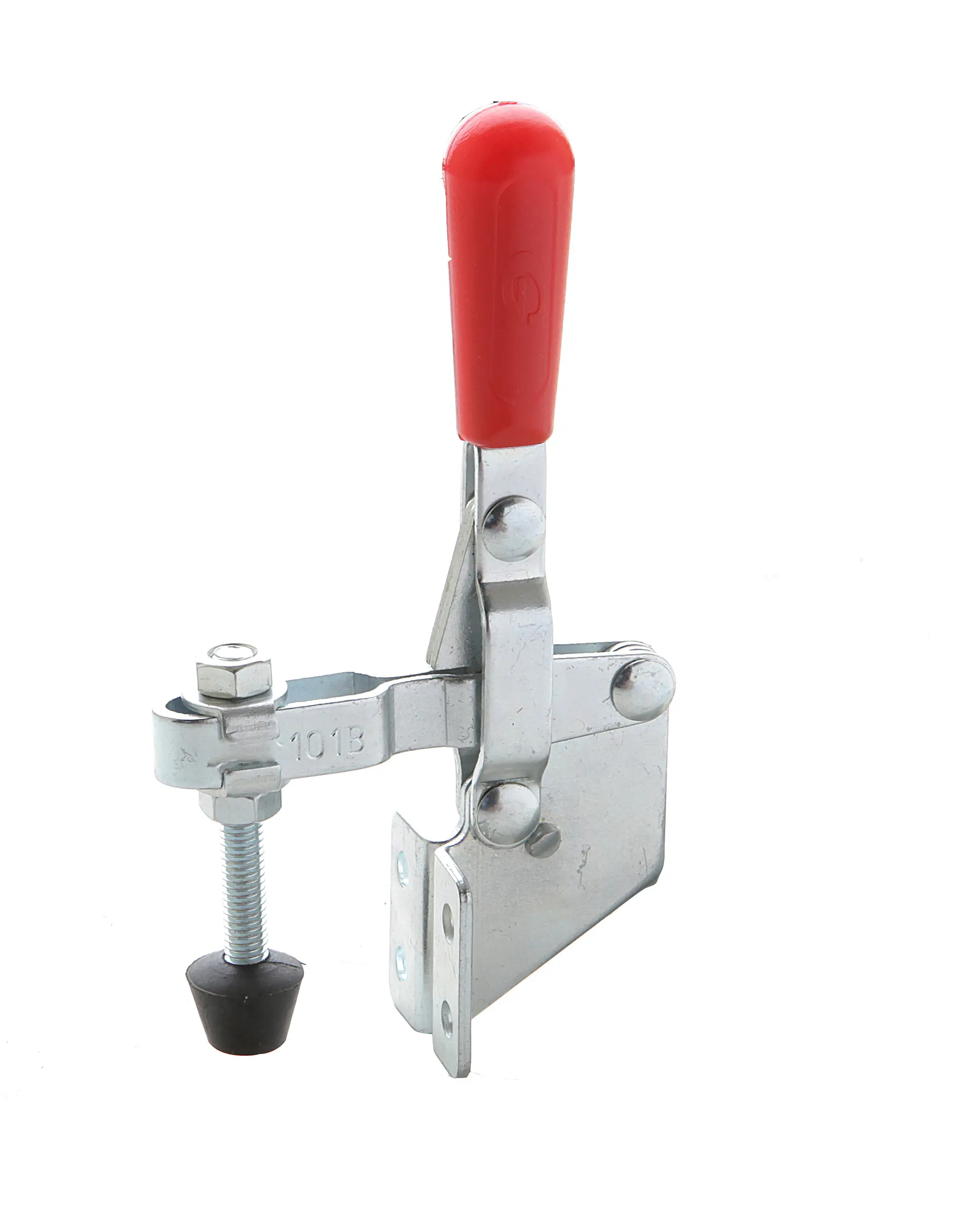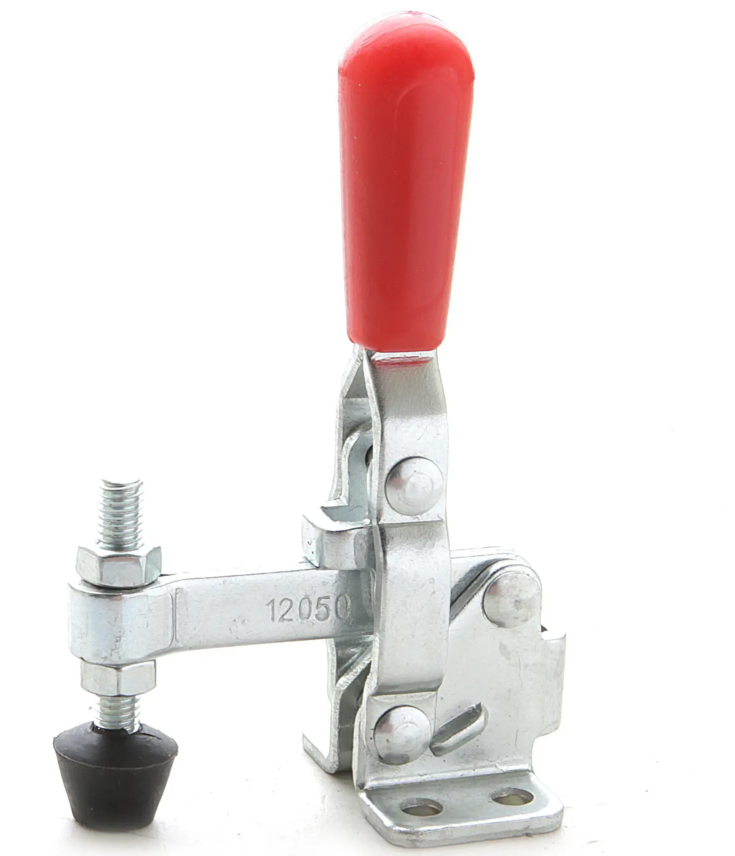 это зажим с рукояткой, направленной под углом 90° к поверхности, на которую устанавливается механизм. Чтобы зафиксировать деталь или сборочную единицу достаточно одного движения — переместить рукоятку в положение перпендикулярное плоскости установки.