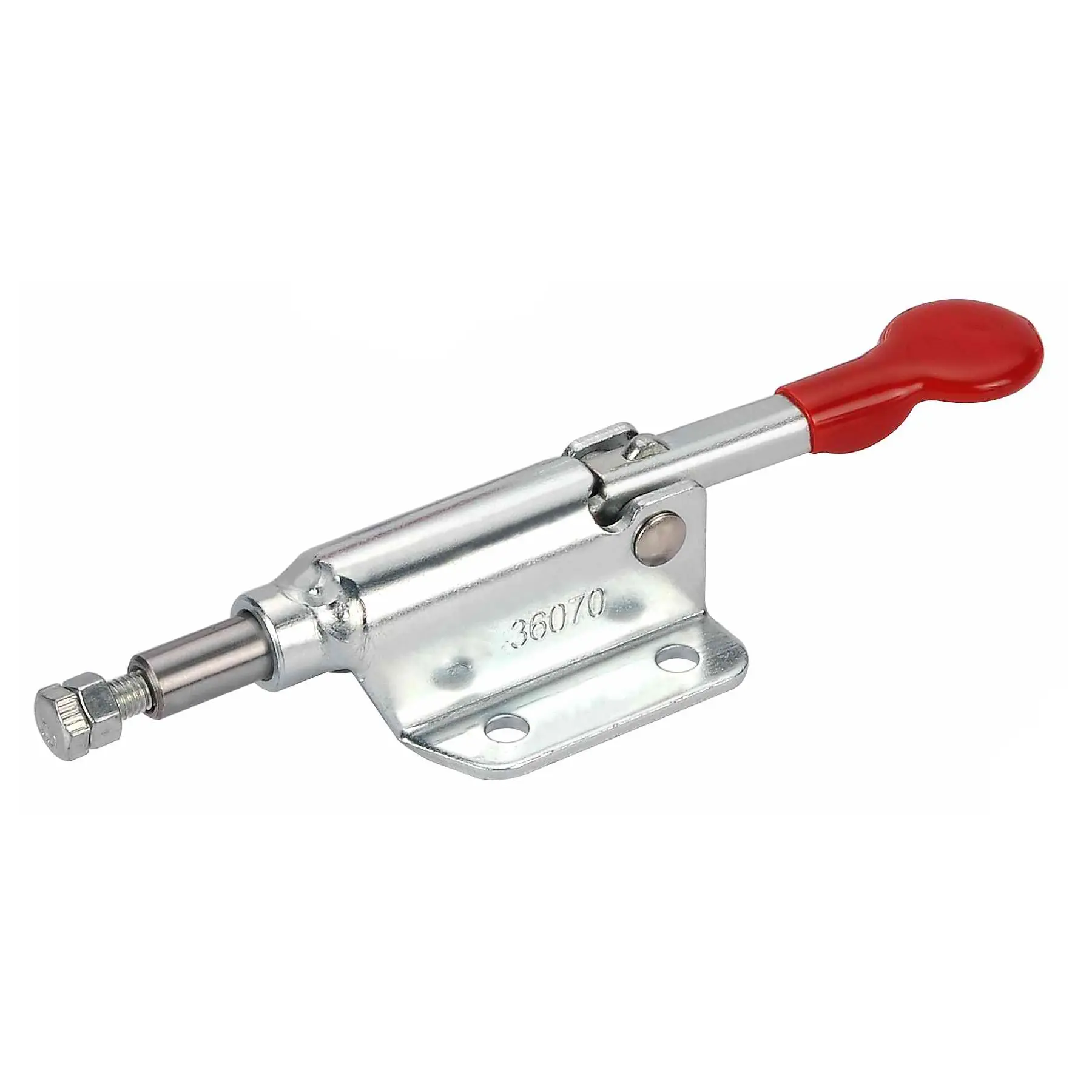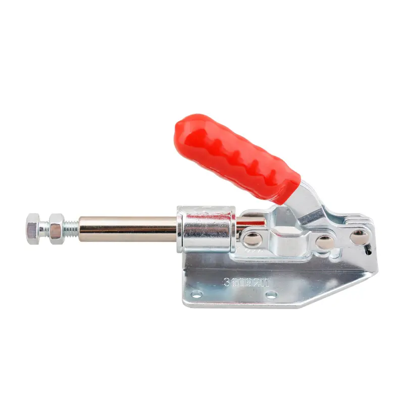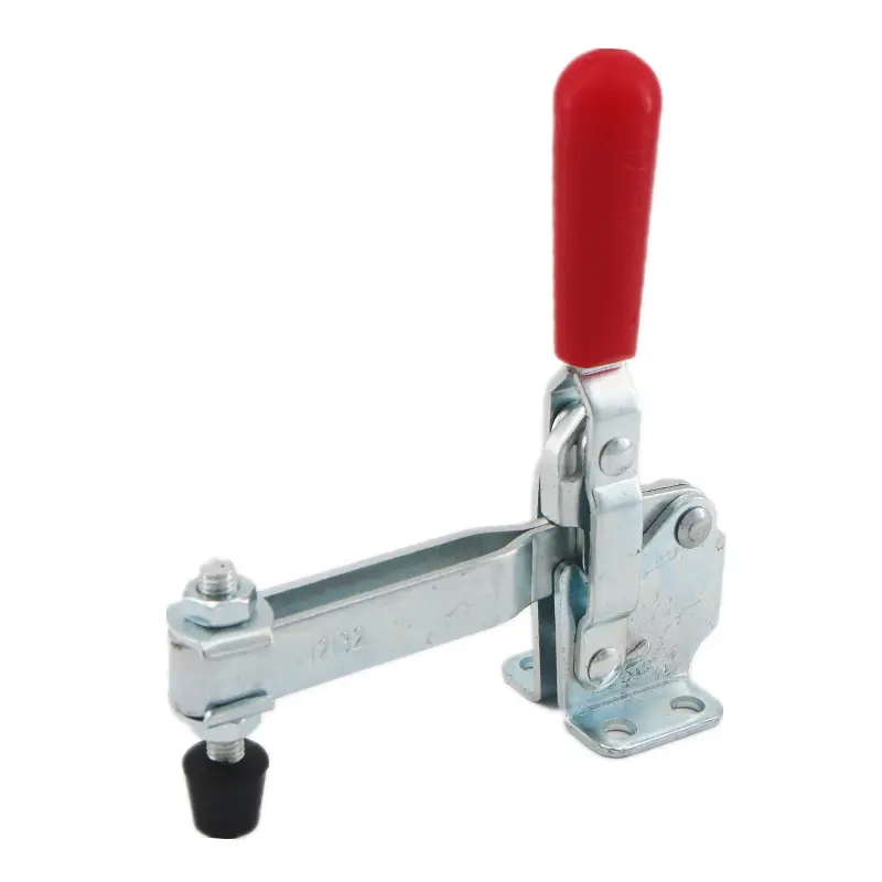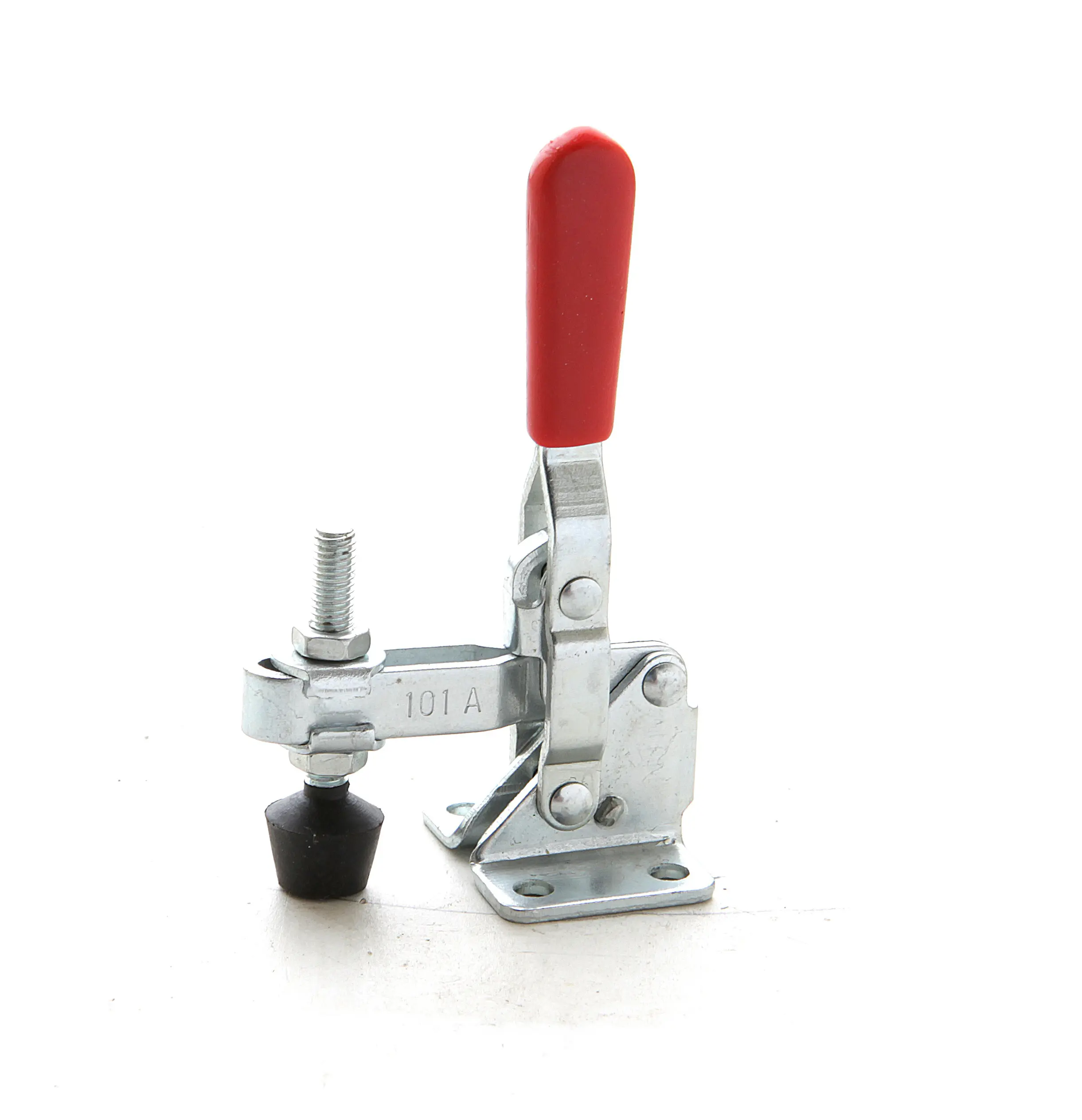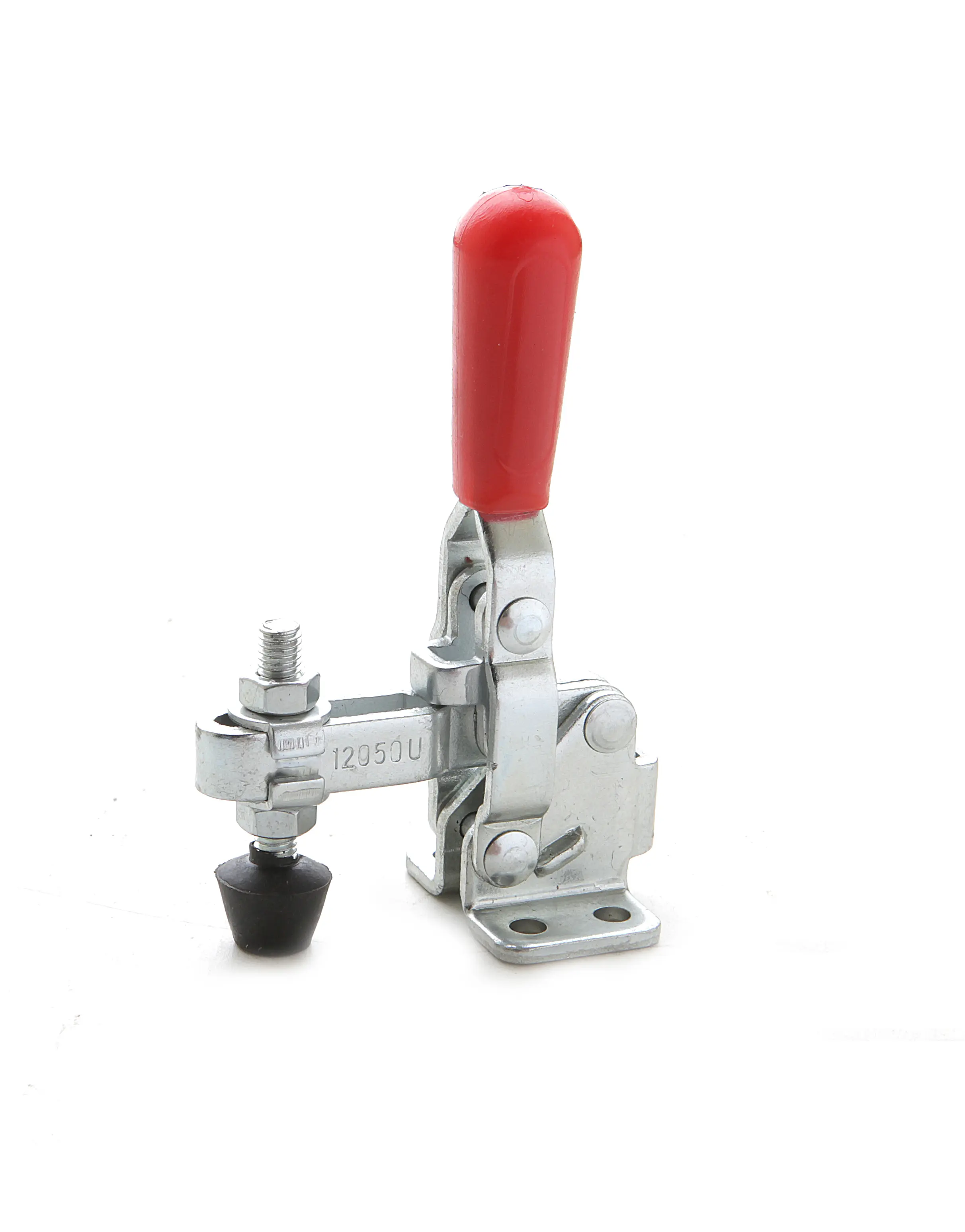 это зажим с рукояткой, направленной под углом 90° к поверхности, на которую устанавливается механизм. Чтобы зафиксировать деталь или сборочную единицу достаточно одного движения — переместить рукоятку в положение перпендикулярное плоскости установки.