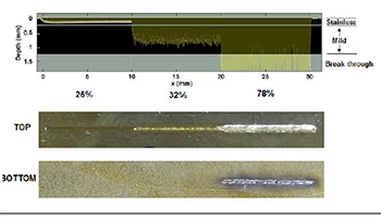 На изображении справа демонстрируется измерение глубины сварного шва, выполненным волоконным лазером мощностью 1 кВт. Прокладка из нержавеющей стали толщиной 0,38 мм приварена к пластине из мягкой стали толщиной 1 мм. Для наглядности использовались три режима сварки: при 26%, 32% и 78% мощности. В первом случае сварка с первичной проводимостью не удалась, так как она не проникает через прокладку. Во втором случае сварка выполнена успешно и находится внутри пластины. В последнем – сквозное проплавление.