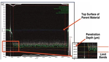 Данные о проницаемости сварного шва верхней поверхности свариваемой детали показаны по оси Y (разрешением на уровне микрона). По оси X откладывается время в миллисекундах. Границы допустимого минимального и максимального уровня проникновения вводятся конечным пользователем.