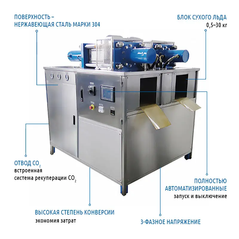 Оборудование преобразует жидкий углекислый газ в твёрдый лёд посредством резкого снижения давления. В результате образуется углекислый "снег", который затем прессуется в блоки заданного размера и формы. Автоматизированный процесс позволяет поддерживать стабильное качество продукции, а гидравлическая система обеспечивает равномерное формирование блоков.