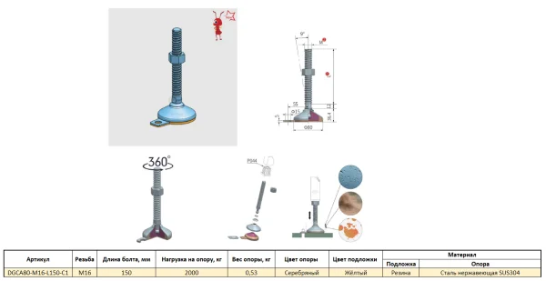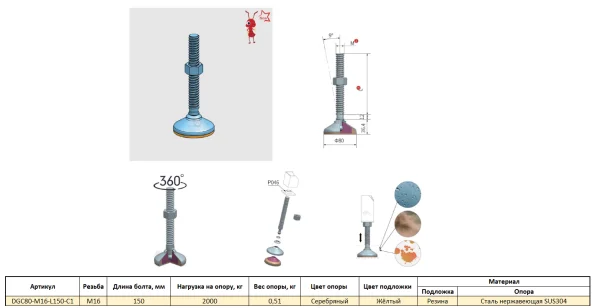 DGC80-M16-L150-C1 Универсальная регулируемая опора M16x150 Ø основания 80 мм. Сталь нержавеющая SUS3