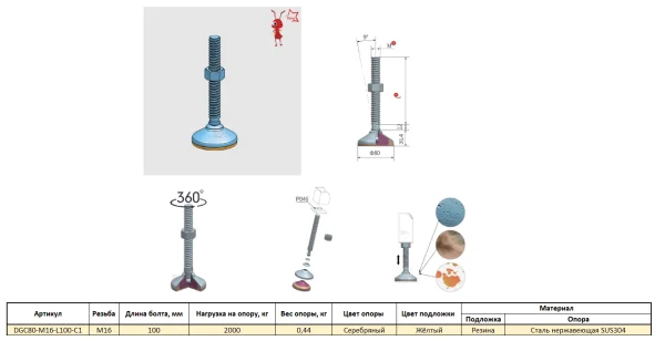 DGC80-M16-L100-C1 Универсальная регулируемая опора M16x100 Ø основания 80 мм. Сталь нержавеющая SUS3