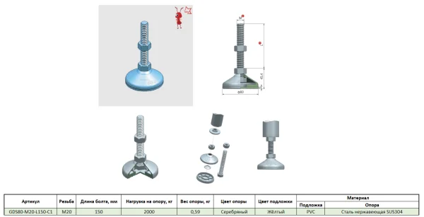 DGT80-M20-L150-C1 Универсальная регулируемая опора M20x150 Ø основания 80 мм. Сталь нержавеющая SUS3