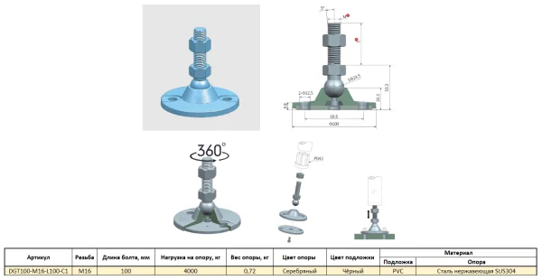 DGT100-M16-L100-C1 Универсальная регулируемая опора M16x100 Ø основания 100 мм. Сталь нержавеющая SU