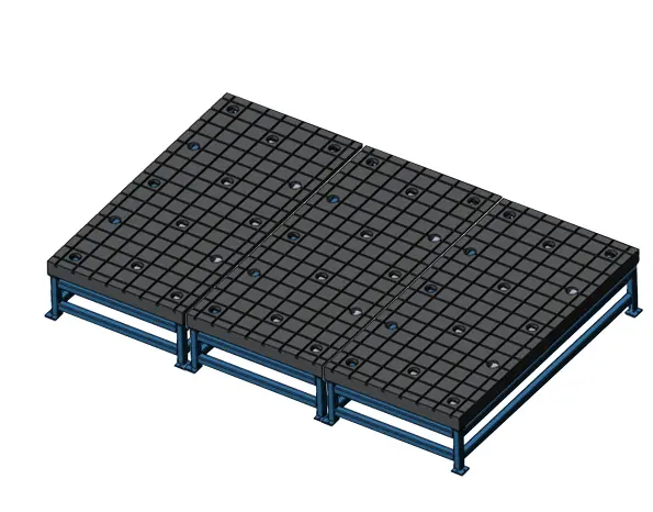 Стенд из плит представляет из себя рабочую зону из несколько чугунных плит (поверочных по ГОСТ 10905-85 либо монтажных с Т-пазами). Опорой для плит служит сварная рамная конструкция из конструкционной стали. Высота стенда проектируется исходя из требований Клиента, но как правило также учитывается, чтобы рабочим либо сварщикам стоя было удобно выполнять рабочие операции. Чаще всего высота от пола цеха до рабочей поверхности плит находится в пределах 800 – 1000 мм. Для точного позиционирования плит между собой, стенды оснащаются регулировочными и фиксационными винтами. Грузоподъемность одной секции стенда составляет 8 тонн.