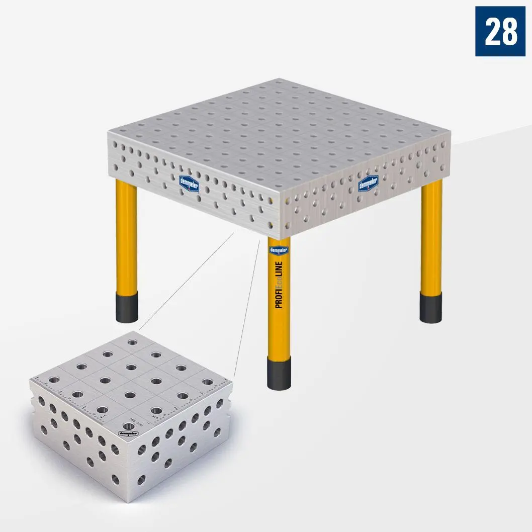 Сварочные столы отличаются от обычных верстаков и слесарных инструментальных столов высокой точностью и возможностью позиционирования деталей. Столешница имеет координатную сетку отверстий, благодаря которой легко устанавливаются угольники, упоры и другие аксессуары для сборки металлоконструкций.