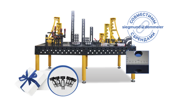 Конструкция стола с системой отверстий позволяет использовать оснастку для точной фиксации свариваемых деталей из нержавеющей стали, алюминия и конструкционных сталей.