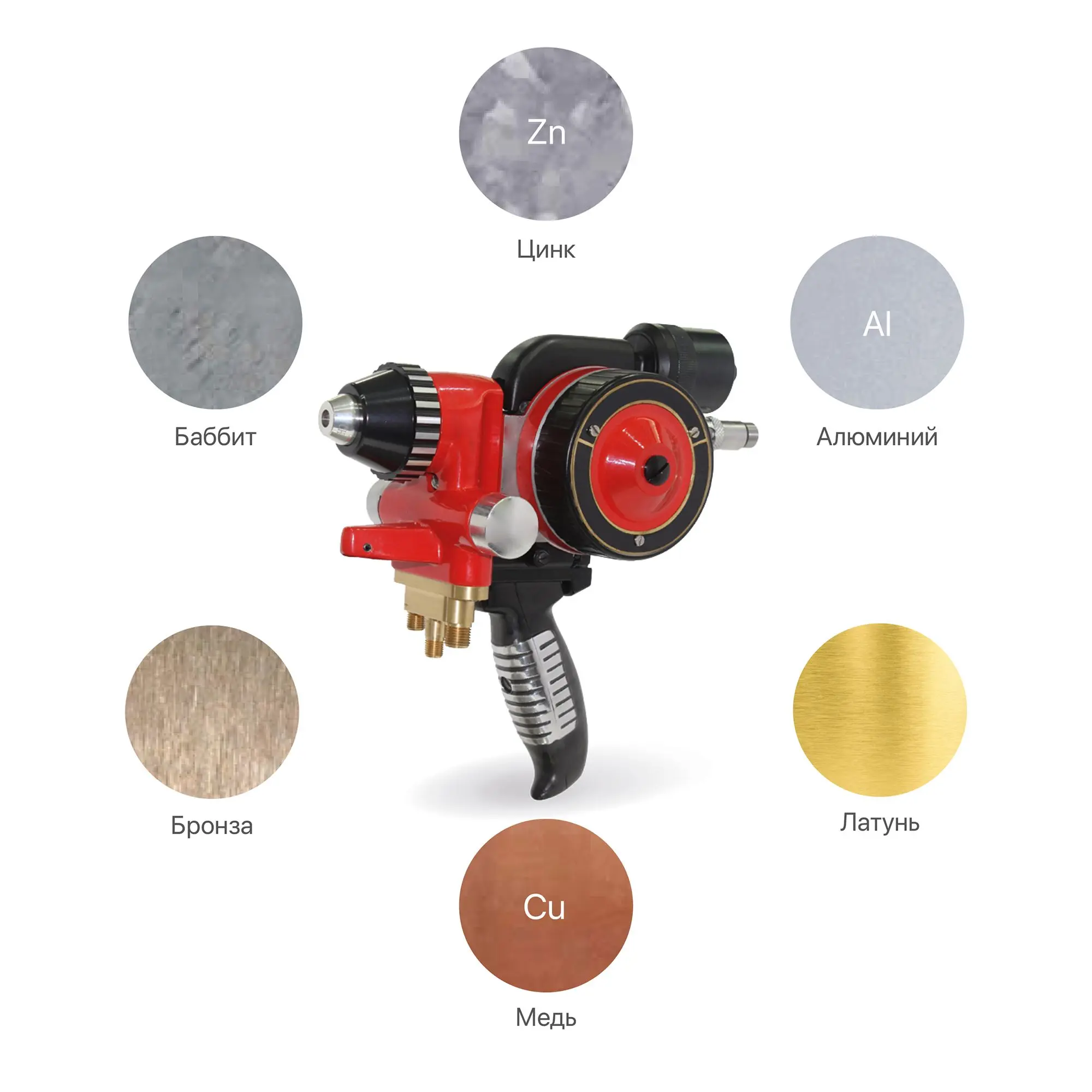 | Производительность напыления | Алюминий: ~ 5,0 кг/ч Цинк: ~ 21,80 кг/ч Олово: ~ 22,70 кг/ч Баббит: ~ 22,70 кг/ч |