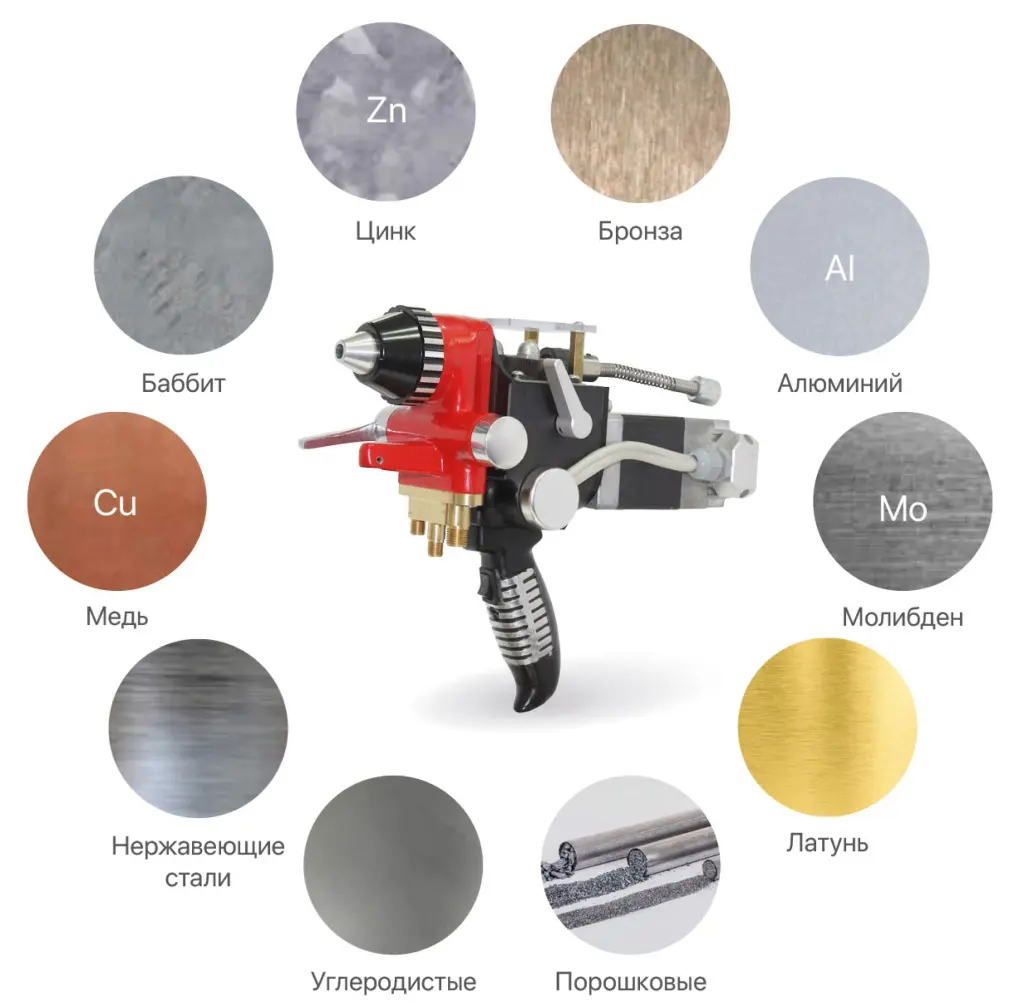 | Производительность напыления | Алюминий: ~ 5,0 кг/ч Цинк: ~ 21,80 кг/ч Молибден: ~ 3,40 кг/ч Углеродистая сталь: ~ 5,90 кг/ч Медь: ~ 10,90 кг/ч |