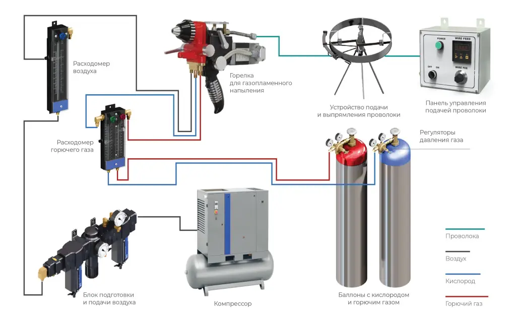 Установка SPRAYJET‑88‑EL предназначена для ручного или автоматизированного газопламенного напыления различных материалов в виде проволоки. Отличительной особенностью пистолета является наличие электропривода, обеспечивающий однородную и постоянную подачу проволоки как из легкоплавких, так и из тугоплавких металлов, диаметром от 1,6 до 4,76 мм. Позволяет напылять такие материалы как — углеродистые стали, нержавеющие стали, медь, латунь, бронза, баббит, цинк, алюминий, молибден и т.д. Получаемые покрытия могут иметь толщину 0,05 — 15 мм, пористость от 2 до 15%. Применяется для восстановления изношенных мест, нанесения коррозионностойких, износостойких, антифрикционных и электроизоляционных покрытий. Данное оборудование является полным аналогом систем для ручного газопламенного напыления Oerlikon Metco модель 12Е.